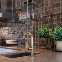 Art meets craft. The Litze Kitchen Collection melds innovative engineering and artistry to strike a balance that is equally at home in modern classic environments and urban industrial spaces. This single-handle bar/prep faucet features an industrial lever handle and a 360-degree rotating, high-arc spout. The faucet measures 11-5/8″ high with a 6″ spout reach. Comes with 3/8″ staggered copper supply lines with 1/2″ adapters.