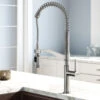 Art meets craft. The Litze Kitchen Collection melds innovative engineering and artistry to strike a balance that is equally at home in modern classic environments and urban industrial spaces. This single-handle kitchen faucet has a dual-jointed articulating arm with a semi-flexible hose, an industrial lever handle, and a two-function sprayer that lets you choose from spray and stream modes at a push of a button. The arm rotates 360 degrees and moves up and down in height to provide optimal reach and access to even large pots.
