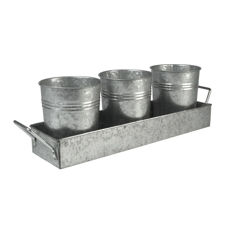 The Masonware Galvanized Picnic Caddy is a great farm to table accessory. Made of rolled iron, it has a galvanized that is coated to make it totally food safe. The caddy features a rectangular tray with riveted handles and three cups to hold utensils, napkins, and flatware. It also is great for use as planters for herbs. Handwashing is recommended.