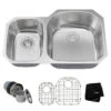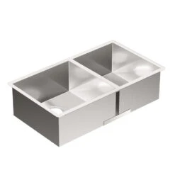 High-quality construction and extensive selection come together in the Moen 1800 Series kitchen sinks. Strong 18-gauge stainless steel serves as a solid base for this double-bowl undermount kitchen sink. Exceptional sound deadening and a wear-resistant, uniform brushed finish, all backed by functionality and beauty are the hallmarks of this collection. This sink features one 16″ wide x 16″ long x 8-1/2″ deep basin on the left and one 12-1/2″ wide x 16″ long x 8-1/2″ deep basin on the right, each with a rear drain opening. Made in the USA.