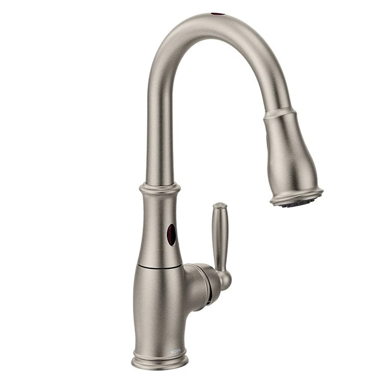 This versatile, single-handle faucet lets you control the faucet hands-free via the wave sensor and the ready sensor, or by manual operation of the single lever handle. The high arc spout rotates 100 degrees for maximum reach and height clearance to fill even large pots. The pull-down wand blends seamlessly with the spout and offers an aerated stream, pause function, and a powerful cleaning rinse. Includes an optional escutcheon for three-hole installation. The faucet features the Duralock quick-connect system for easy installation. MotionSense control unit is powered by six AA batteries (not included) or optional AC power adapter (sold separately). The faucet measures 15-1/2″ high with a 7-7/8″ spout reach.