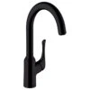 This single-handle bar/prep faucet features a high-arc, gooseneck swivel spout with an aerated stream and a separately mounted, easy-to-use lever handle. The Duralock quick-connect system allows for easy installation. The faucet measures 11″ high with a 5-1/4″ spout reach.