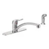 This single-handle kitchen faucet features a swivel spout, ADA-compliant lever handle, and metal construction. Includes flexible supplies with 3/8″ compression fittings. Measures 8-1/8″ high with a 9-1/4″ spout reach. Includes a separate side sprayer with Hydrolock quick-connect system.