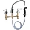 This single-handle kitchen faucet features a swivel spout, ADA-compliant lever handle, and metal construction. Includes flexible supplies with 3/8″ compression fittings. Measures 8-1/8″ high with a 9-1/4″ spout reach. Does not include a side sprayer.