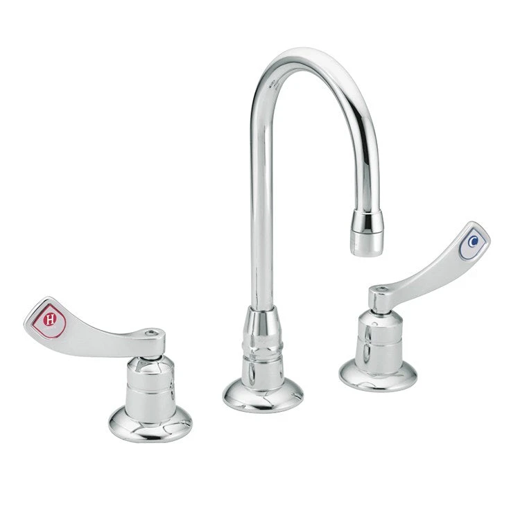Moen Commercial’s line of M-Dura heavy-duty products are built to last with vandal-resistant features to help reduce your facility’s maintenance costs. This two-handle widespread bar/pantry faucet features wrist-blade handles with decal-style hot/cold temperature indicators, 1/4 turn operation, and a high-arc gooseneck spout. Measures 10-3/4″ high x 15-3/4″ wide with a 5-1/4″ spout reach.
