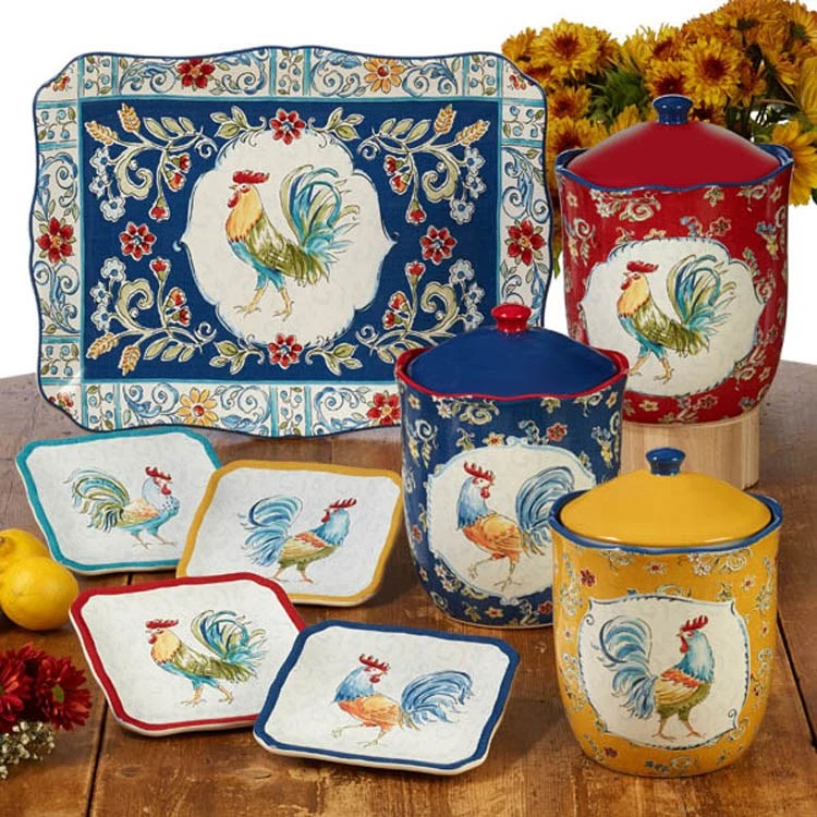 The colors of Provence with charming roosters adorn each item in Certified International’s Morning Bloom ceramic dinnerware and serveware collection. Designed by Daphne B, the bright floral patterns frame each rooster on uniquely shaped plates and bowls, complemented by a proud rooster hand painted cookie jar and S&P set.
