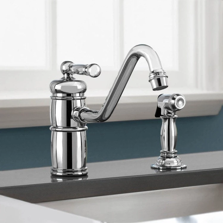 Create an atmosphere of warmth and elegance with the Nadya collection. The refined and balanced design combines softly sculpted curves and classic traditional detailing. This single-handle kitchen faucet is durably crafted from solid brass to provide years of dependable service.