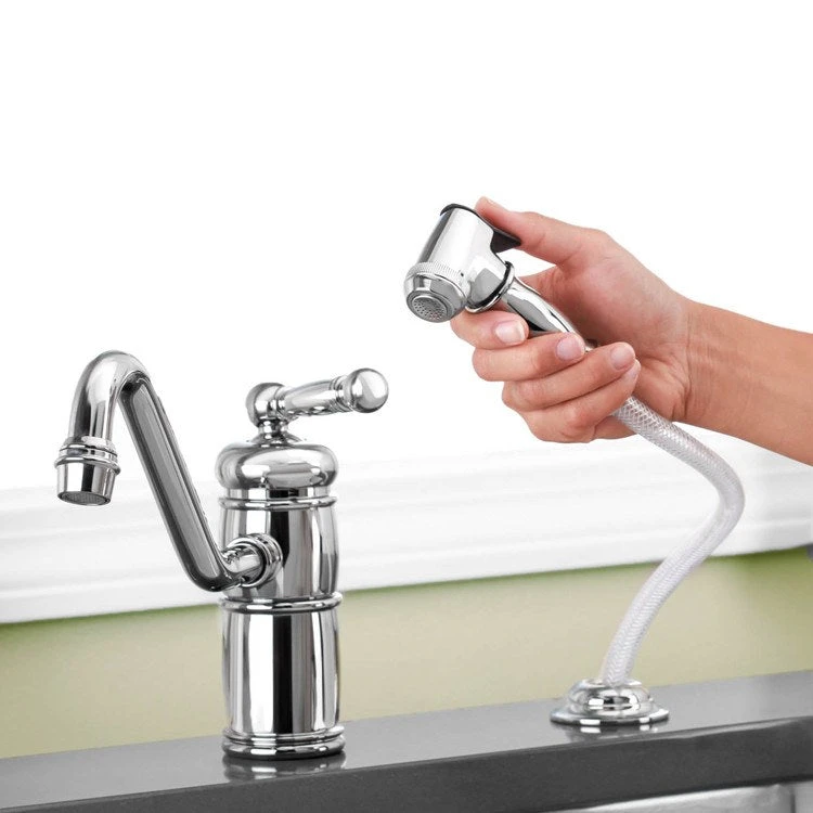 The faucet features a swivel spout assembly with a top-mounted, ADA-compliant lever handle, top-accessible diverter, and a ceramic disc valve cartridge to ensure smooth operation and drip-free performance. Includes a separate solid brass pull-out side sprayer assembly.
