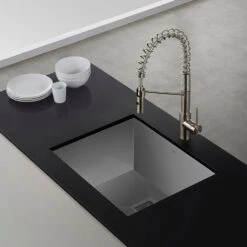 Pax Series sinks have clean geometric designs, with zero-radius corners for the distinctive look of a commercial sink in the home kitchen.