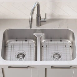 - Smart low divider provides the spaciousness of a single bowl sink with the functionality of a double bowl. extra clearance allows you to wash large items over both sink bowls, preventing overflow onto the kitchen counter