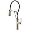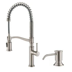 - Commercial pull-down design combines an industrial open coil spout with traditionally-inspired details for a timeless look, offers the convenience of a pull-down sprayer with extended range of motion