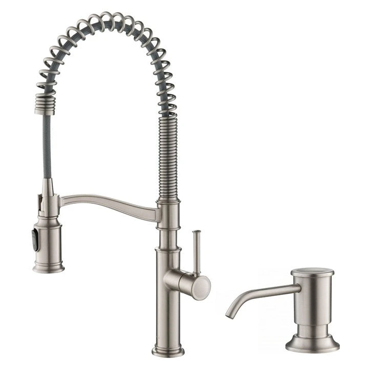 The Sellette Commercial Pull-Down Faucet reimagines industrial style with classically-inspired elements. Combining a high-arc open coil spout with traditional details and an elegantly curved docking arm, Sellette creates a timeless look. The highly functional design features an ergonomic pull-down spray head with aerated stream for everyday cleaning, and powerful spray for heavy-duty rinsing. Reach technology offers an extended range of motion, with an easy-retract hose and swivel adapter for maximum flexibility. Soft rubber nozzles in the spray face wipe clean with a swipe of your finger, making it easy to maintain a long-lasting powerful flow. Comes with a soap dispenser and optional deck plate which allows you to install this single handle faucet with a 1, 2, or 3-hole sink. Heavy-duty construction and premium components ensure long-lasting worry-free use. This faucet is available in all-Brite Spot Free Stainless Steel, which prevents fingerprints and requires less cleaning.