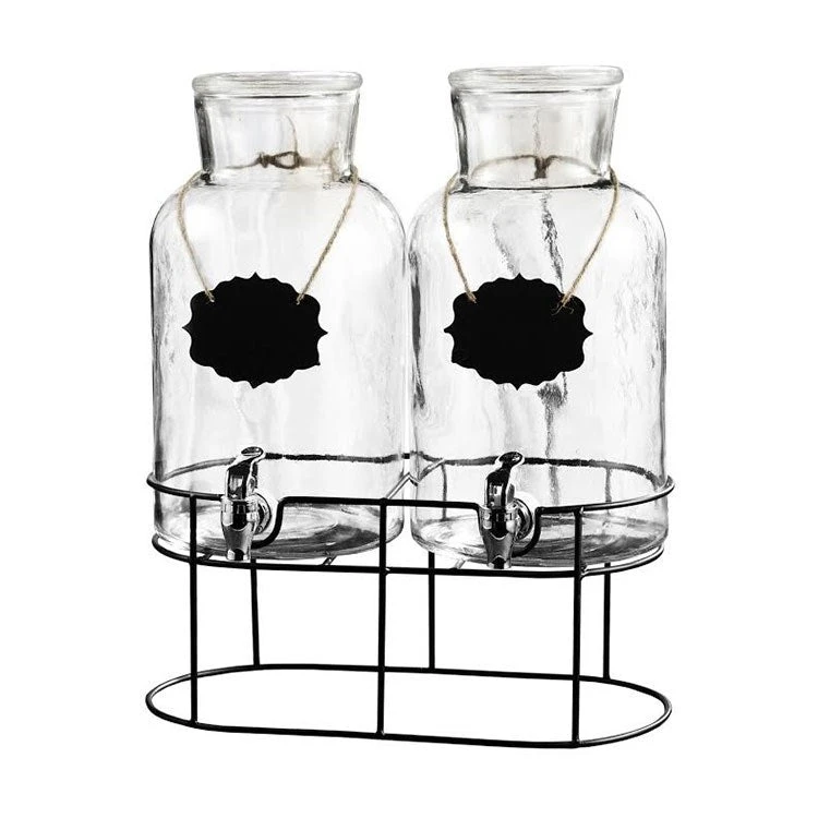 Whether you’re serving homemade iced tea, fresh-squeezed lemonade, refreshing spa water, bride and groom’s signature drink, or a crazy mixed concoction, this Sierra Chalkboard Double glass beverage dispenser set with glass lids and metal rack from Stylesetter is the life of the party! Accommodating 1.2 gallons each of any cold drink, the pitcher rests on a table or flat surface for guests’ pouring convenience. Just place a glass under the leak-proof acrylic spigot, fill up with your favorite beverage, and behold the dispenser’s elegant country style. Remove the airtight lid, easily pour in your ingredients, and create a practical (and pretty!) centerpiece in a matter of seconds. This dispenser makes the perfect present for a wedding, birthday, engagement, anniversary and beyond. Tighten the spigot before use. Be sure to tightly seal the included washers on both sides of the dispenser. The dispenser measures 15 x 7.5 x 16.5″. Handwash.