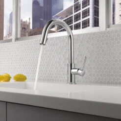 Inspired by the simple lines of Scandinavian design, the Solna collection takes contemporary style to a whole new level. This single handle faucet defines sleek with its simple curved shape and minimalist lever handle. The two-function, pull-down wand features a seamless design with the MagneDock magnetic docking system and offers a choice of spray and stream settings via an ergonomic button. Dual integral check valves in the sprayer prevent backflow. Spout swings 360 degrees and measures 9-3/32″ long x 15-11/16″ high. Designed for single-hole mounts or three-hole installation using optional escutcheon (sold separately).