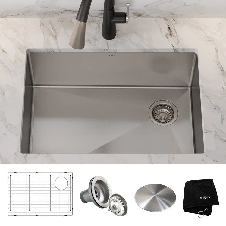- Set includes sink, bottom grid, drain assembly, removable drain cap, Kraus kitchen towel, mounting hardware, cutout template