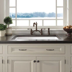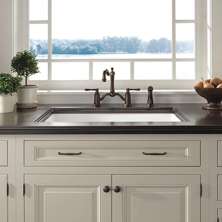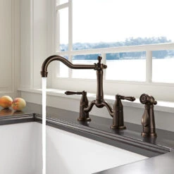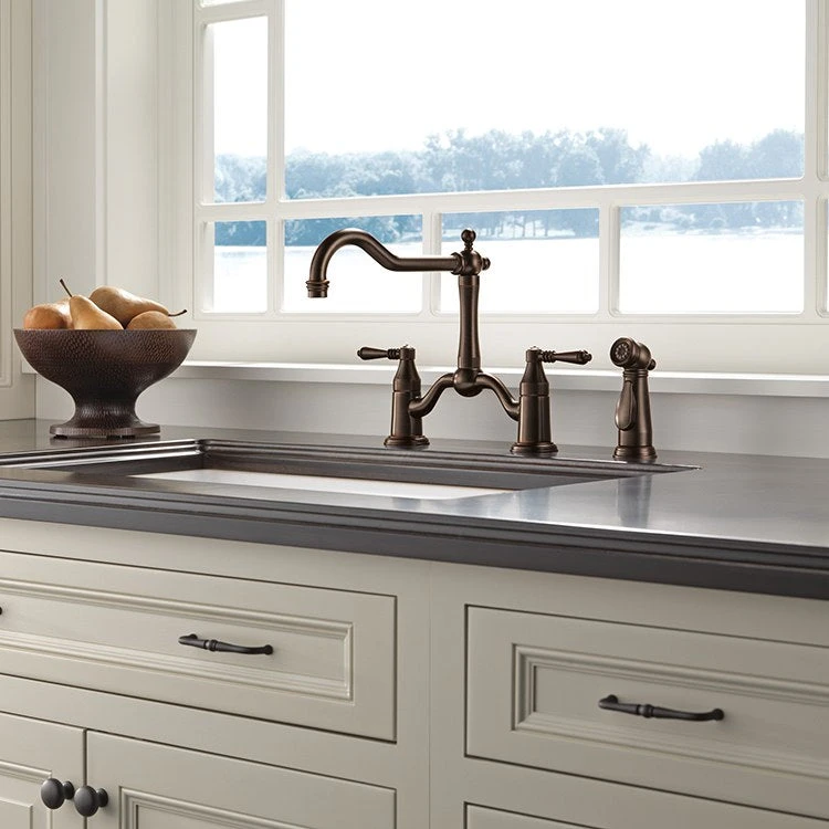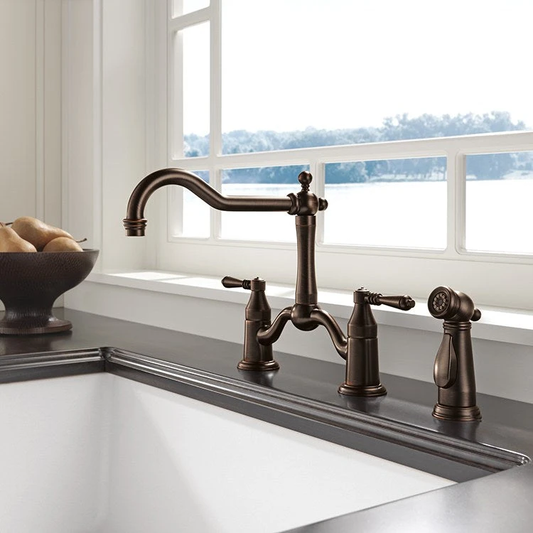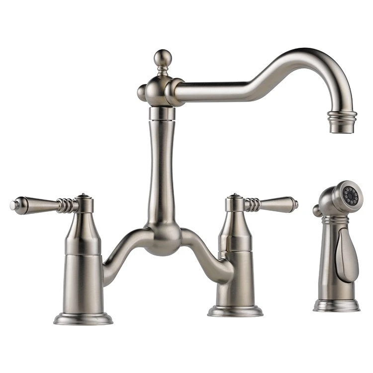 The Brizo 62436-SS Tresa bridge kitchen faucet replicates the old world feel of a true bridge faucet with hot and cold pipes intersecting above the counter. Coordinating side sprayer.