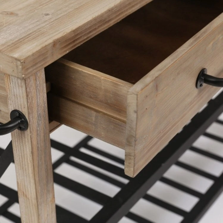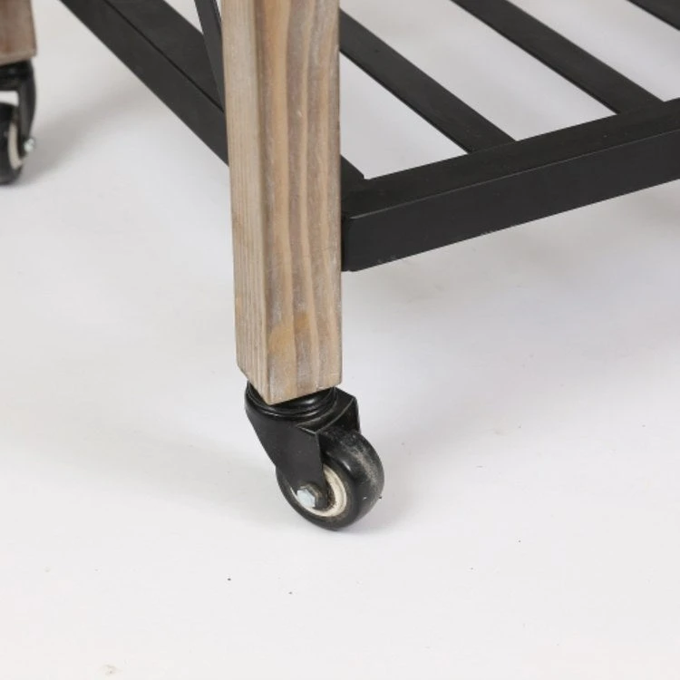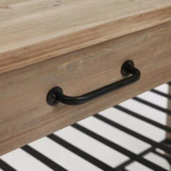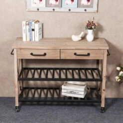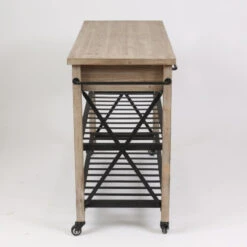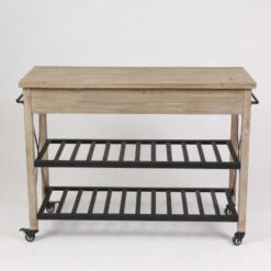 This kitchen cart is functional and stylish with its natural wood finish body and metal racking below. The kitchen cart is an organizer’s dream for adding storage to the kitchen and dining room. With its mobility, this cart can go where you need it most. It includes two pull-out drawers, two open shelves on bottom, and two towel bars on the ends. The rustic and charming mobile kitchen is like its own island standing at 29.5 inches tall and 47.2 inches wide. It is a natural finish wood with metal hardware and shelves. There are four wheels, and two have locking brakes to keep the cart in place while you are working. The handles on each end are perfect for hanging towels and kitchen tools.