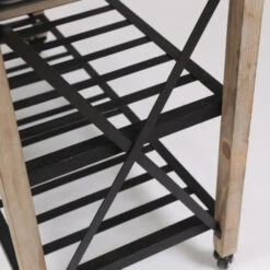- Cart is a natural finish wood with metal hardware and shelves