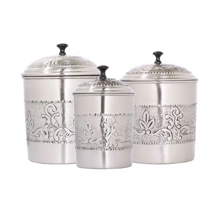 You’ll get plenty of style and storage in this Victoria canister set! The chased motif is handcrafted by skilled artisans, making each an original work of art. The canisters are made of steel with a rich Antique Pewter finish. The set includes three sizes: 3-quart, 4-quart, and 5.5-quart.