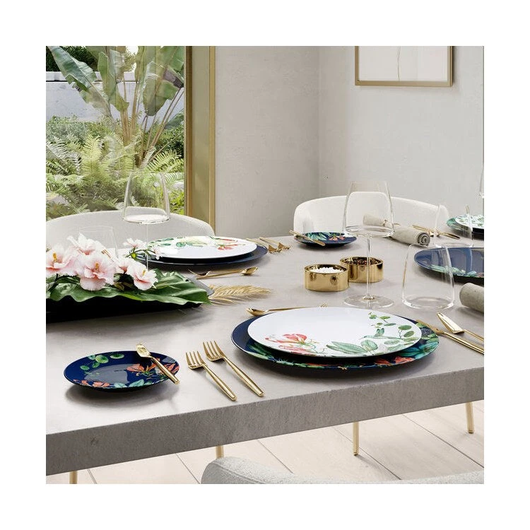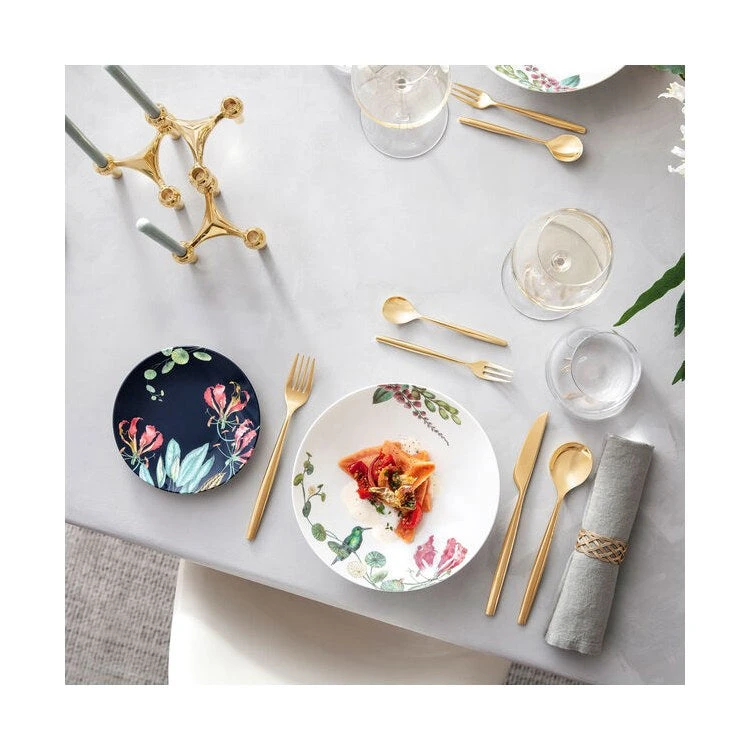 Avarua transforms the dining table into an imaginative paradise where flora and fauna can unfold their beauty. The collection features intricate flowers, leaves and birds. Premium Bone Porcelain has been designed with elegant red flowers of the Gloriosa superba, mangroves and strelitzia leaves in various greens surrounded by color-coordinated hummingbirds. 22K gold detailing accents the collection and provides a three dimensional effect. Dishwasher safe.