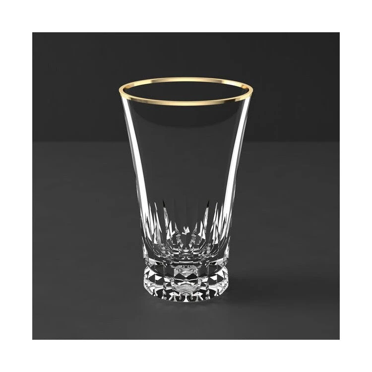 Villeroy & Boch’s Grand Royal glassware collection includes a striking selection of wine glasses, champagne flutes and cocktail glasses that are finely crafted of lead=free, cut crystal glass. Trimmed in precious gold, this luxuriously carved glassware adds glamour to any tabletop it adorns. Lead Free. Dishwasher safe.